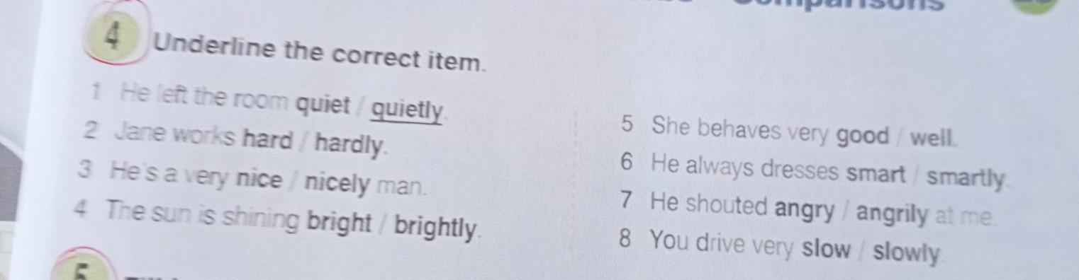 4 Underline the correct item. 1 He left the room quiet / quietly 2 Jane works hard / hardly. 3 He's a very nice / nicely man. 4 The sun is shining bright/ brightly. 5 She behaves very good / well. 6 He always dresses smart/smartly. 7 He shouted angry / angrily at me. 8 You drive very slow slowly.