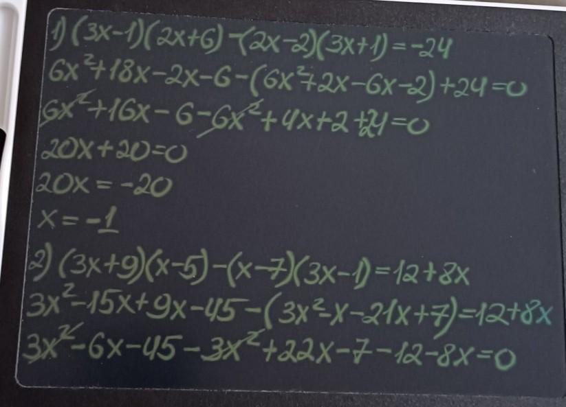 2. Розв'яжіть рiвняння: - - 1) (3x − 1)(2x + 6) - (2x − 2)(3x + 1) = -24; 2) (3x + 9)(x - 5) - (x - 7)(3x - 1) = 12 + 8x.