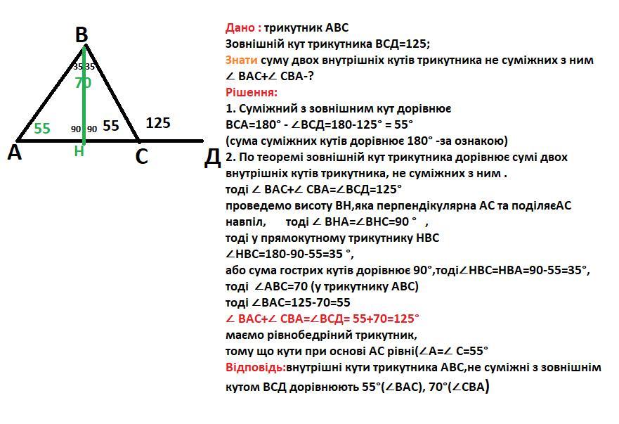 зовнішній кут трикутника=125; знати суму двох внутрішніх кутів трикутника не суміжних з ним