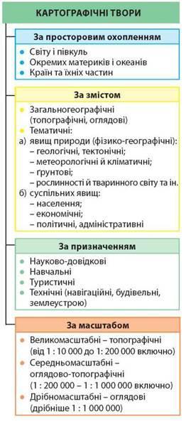 § 2. За текстом підручника та картами атласу скласти схему «Поділ карт на групи» та наведіть власні приклади карт кожної групи. Тема: Карти материків та океанів, їх класифікація за масштабом, просторовим охопленням, змістом і призначенням. OK