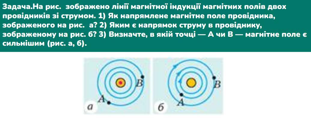 2) На рис. б струм в провіднику напрямлений у напрямку від спостерігача. (Визначили це за допомогою ліній магнітної індукції і правила свердлика)