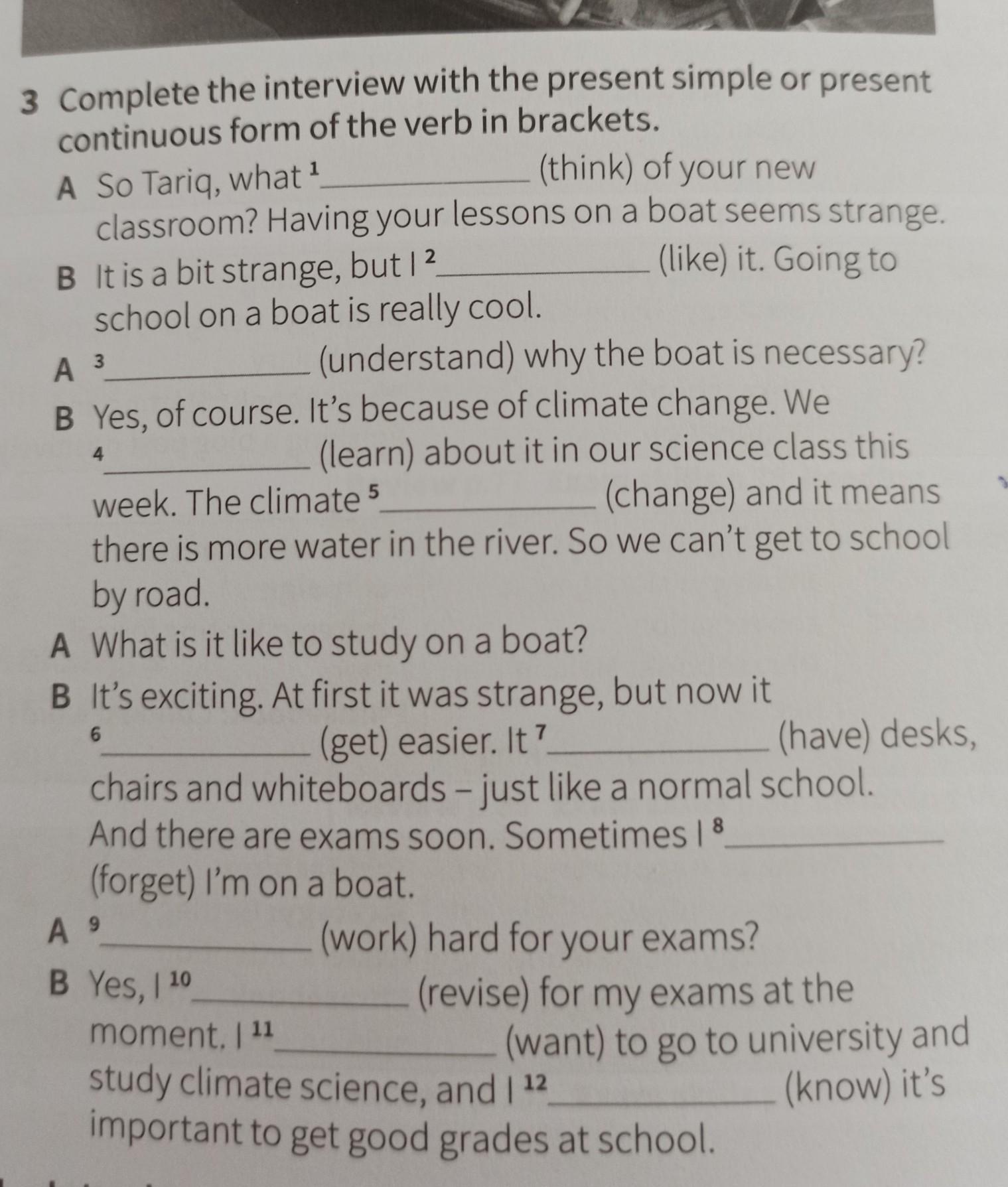So Tariq, what are youthinking of your new classroom? Having your lessons on a boat seems strange. It is a bit strange, but like it. Going to school on a boat is really cool. Do you understand why the boat is necessary? Yes, of course. It's because of climate change. We are learning about it in our science class this week. The climate is changing and it means there is more water in the river. So we can't get to school by road.
