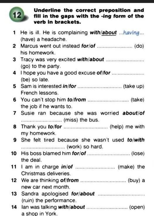 underline the correct preposition and fill in the gaps with the ING for the verb in breacets