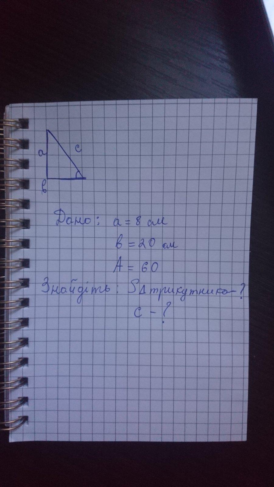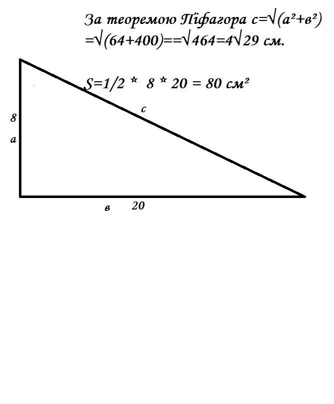 Угол вообще не нужен. Если есть катеты, можно легко найти и гипотенузу, и площадь.