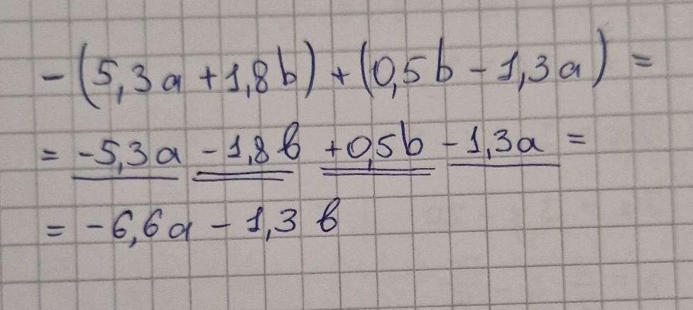 Раскройте скобки и приведите подобные слагаемые в выражении: -(5,3а+1,8b) + (0,5b-1,3a) срочно !!!!