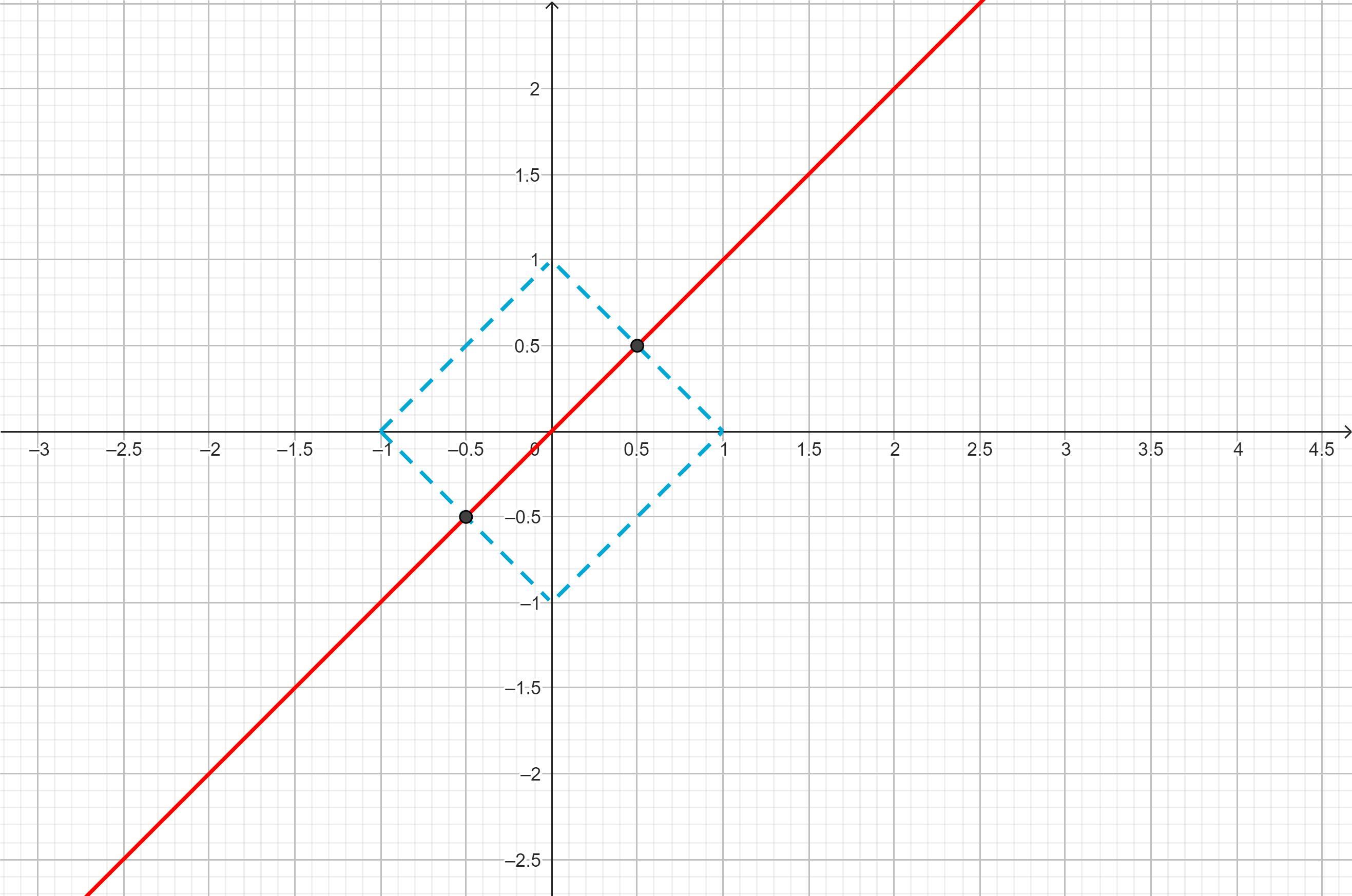 Множина складається з точок, для яких сума абсолютних значень координат дорівнює 1. Це означає, що точки лежать на чотирьох відрізках, які утворюють квадрат з вершинами