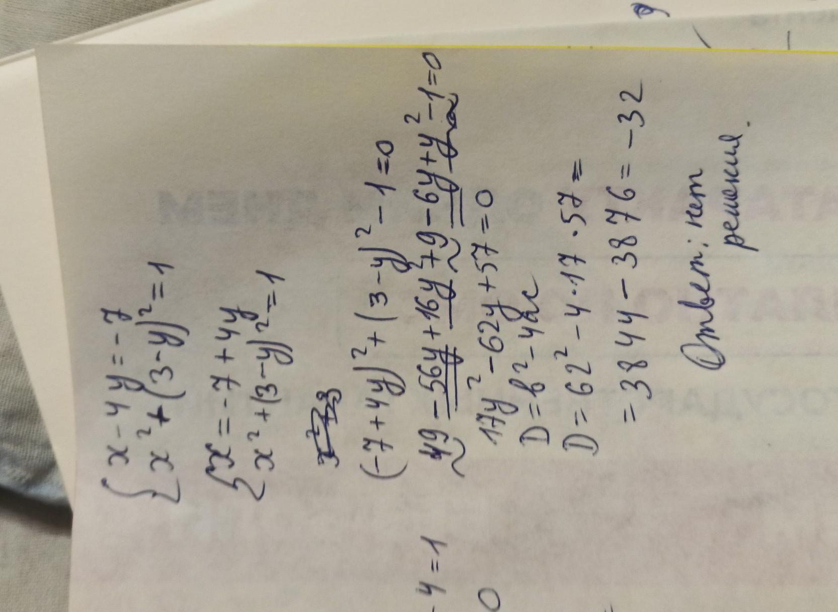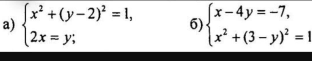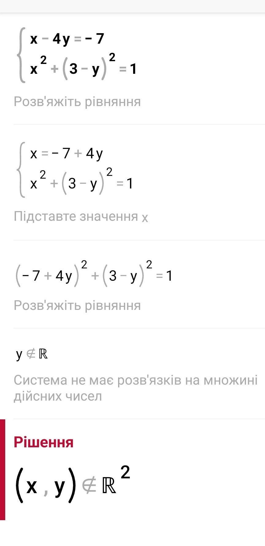 первое уравнение х-4у=-7 второе х²+(3-у)²=1