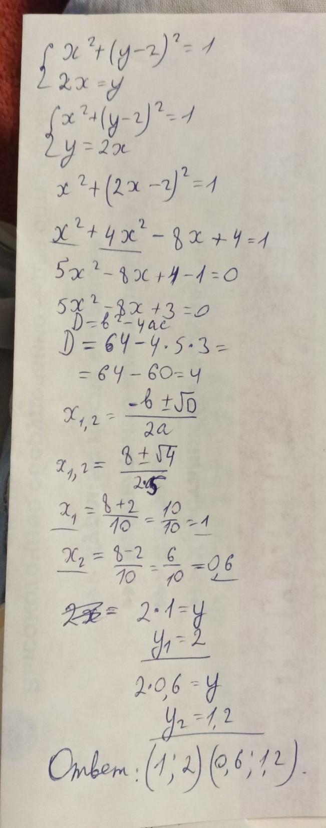 первое уравнение х-4у=-7 , второе х²+(3-у)²=1