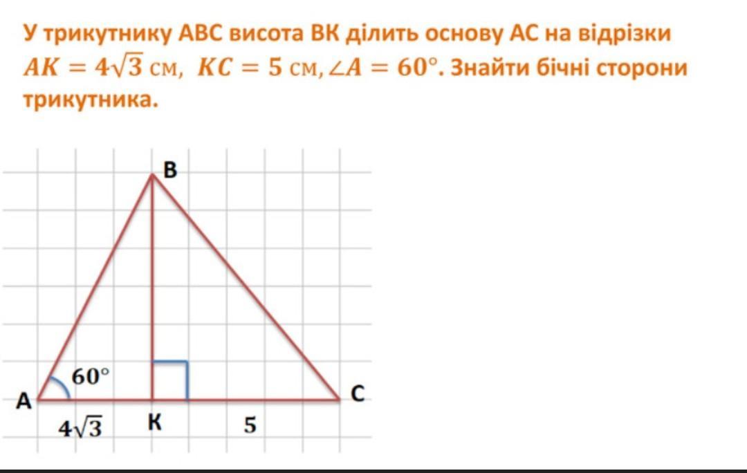 У трикутнику ABC висота ВК ділить основу АС на відрізки АК = 4√3 см, КС = 5 см,