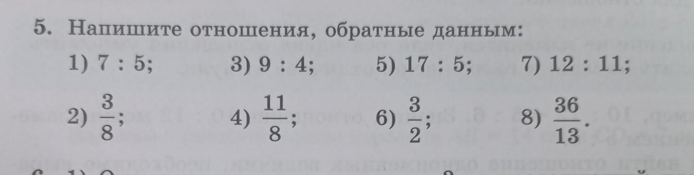 5. Напишите отношения, обратные данным: 1) 7:5; 3) 9:4; 5) 17:5; 2) 3 0000 8 6) 3 7) 12:11; 36 13