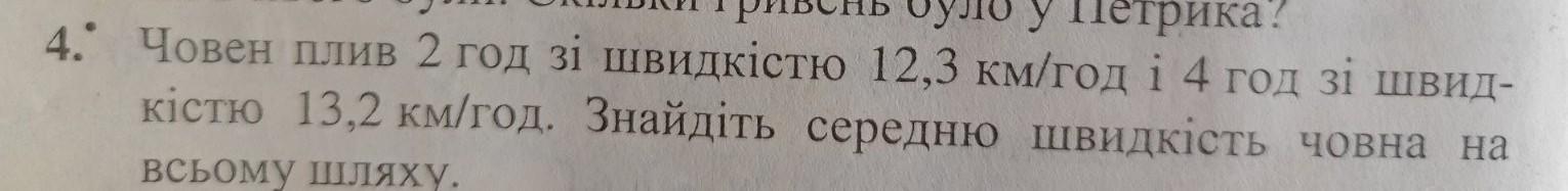 Човен плив 2 год зі швидкістю 12,3 км/год і 4 год зі швид кістю 13,2 км/год. Знайдіть середню швидкість човна на всьому шляху.