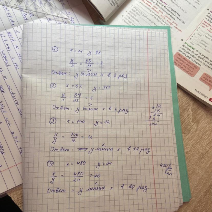 91, Найдите, во сколько раз число х больше или меньше числа у, если: 1) х = 11 и у = 88; 3) x 53 и у 318; 2) х = 144 и у = 12; - 4) х = 480 и у = 24. =