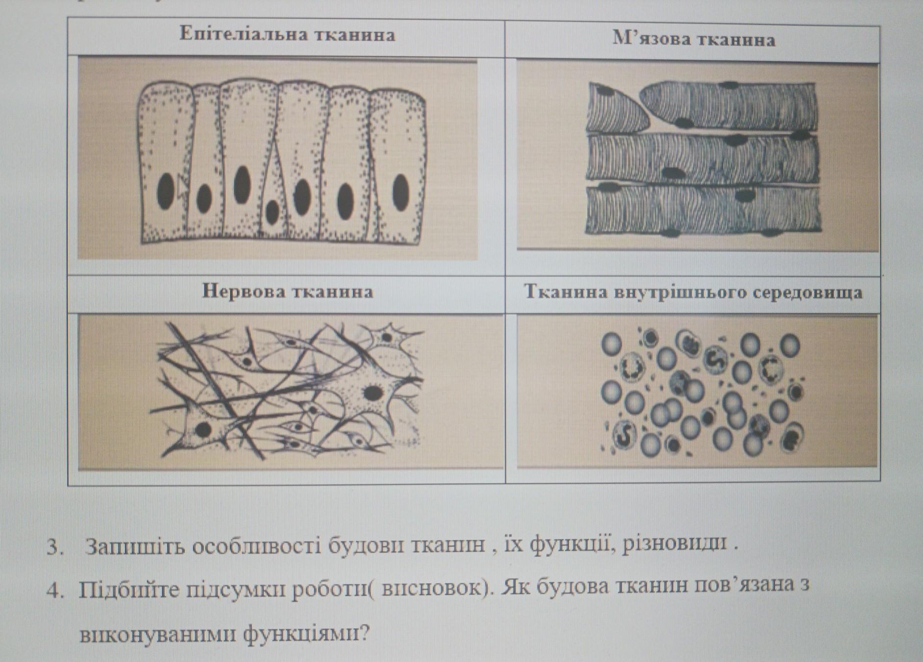 Висновок. Тканини - це сукупності клітин, які мають спільне походження, будову і функцію. Тканини утворюються в процесі ембріонального розвитку і спеціалізуються на виконанні певних завдань у життєдіяльності організму. Будова тканин пов’язана з виконуваними функціями, оскільки кожен тип тканини має свої особливості, які дозволяють їй адаптуватися до конкретних умов і потреб.