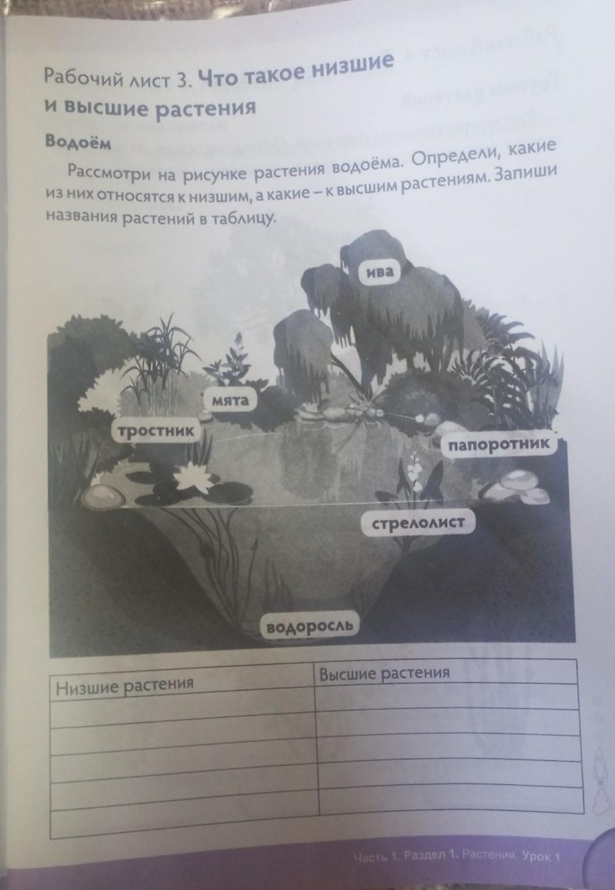 Рассмотри на рисунке растения водоёмы Определи Какие из них относятся к низшим А какие к высшим растениям Запиши названия растений в таблицу название растений ива мята тростник водоросли стрелолист и папоротник это ЕСТЕСТВОЗНАНИЕ