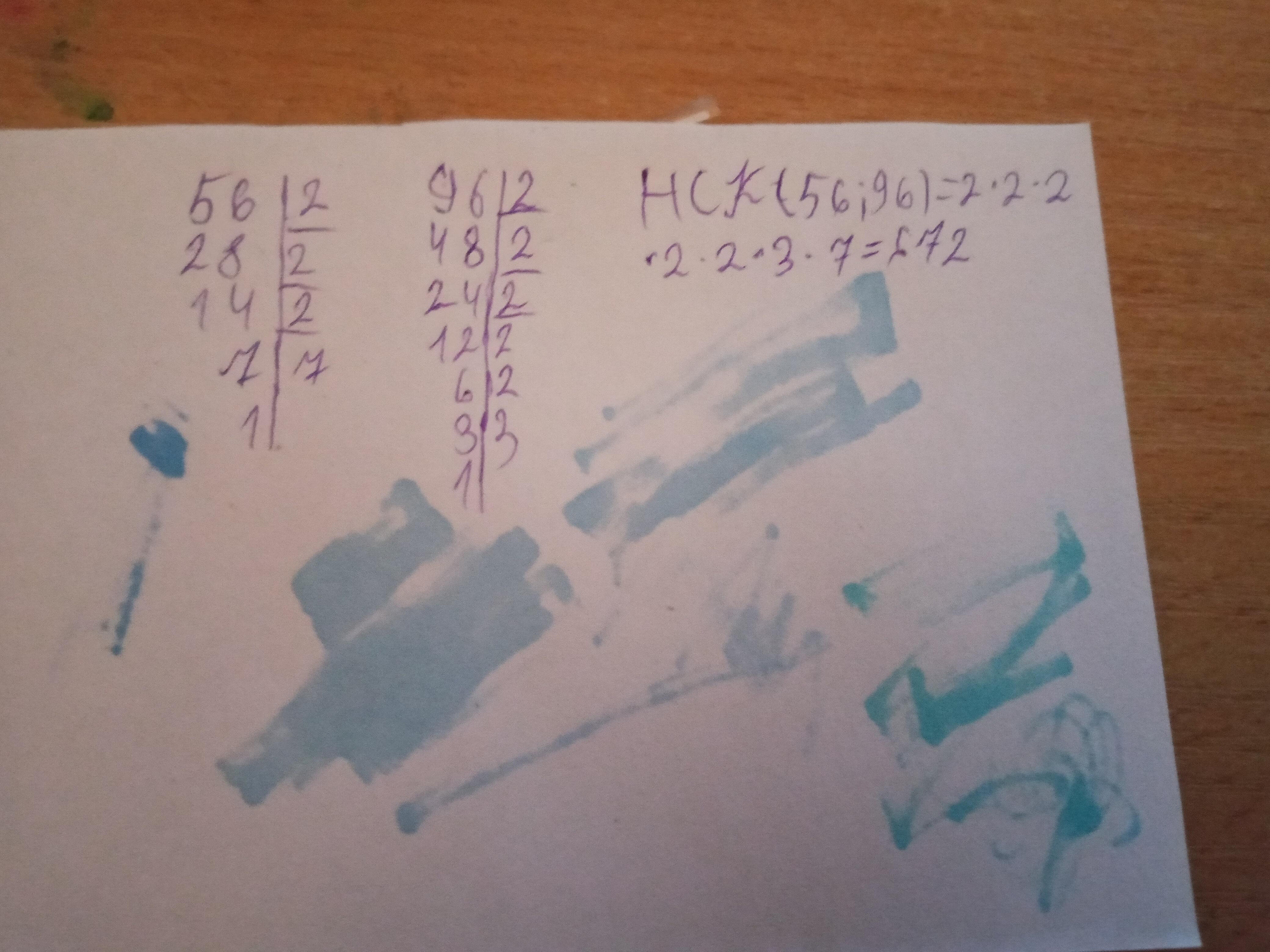 НОК (56; 96) = 2 * 2 * 2 * 2 * 2 * 3 * 7 = 672