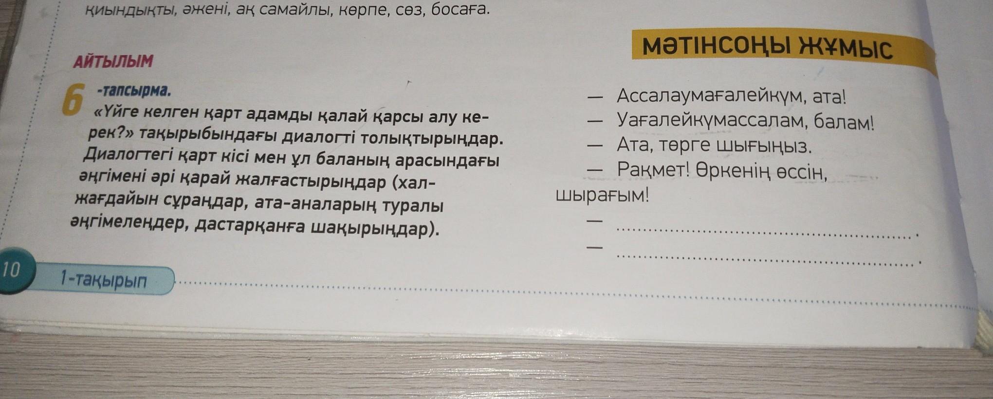 10 қиындықты, әжені, ак самайлы, көрпе, сөз, АЙТЫЛЫМ -тапсырма. 6 «Үйге келген қарт адамды калай карсы алу ке- рек?» такырыбындағы диалогті толықтырыңдар. Диалогтегі қарт кiсi мен ұл баланың арасындағы әңгімені әрі қарай жалғастырындар (хал- жағдайын сұрандар, ата-аналарың туралы әңгiмелендер, дастарқанға шақырыңдар). 1-тақырып - - МӘТІНСОҢЫ ЖҰМЫС - Ассалаумағалейкум, ата! Уағалейкүмассалам, балам! Ата, төрге шығыңыз. Рақмет! Өркенің өссін, шырағым!