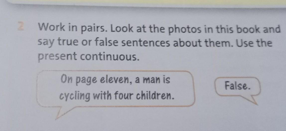 2 Work in pairs. Look at the photos in this book and say true or false sentences about them. Use the present continuous. On page eleven, a man is cycle with four children. False.