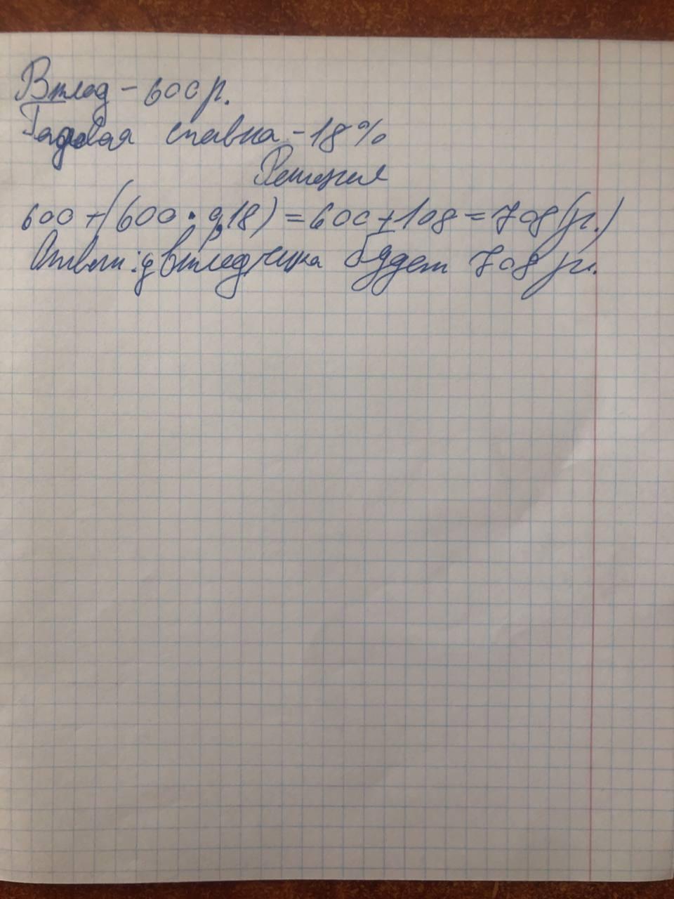 1. Сначала найдем сумму процентов, которые вкладчик получит за год. Для этого умножим 600 рублей на 18% (в виде десятичной дроби, то есть 0,18).