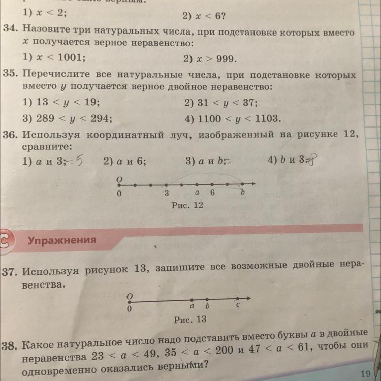 Упражнение 35-1)14,15,16,17,18 2)32,33,34,35,36 3)290,291,292,293 4)1101,1102 Упражнение 36-1) a>3 2)a<6. 3)a3