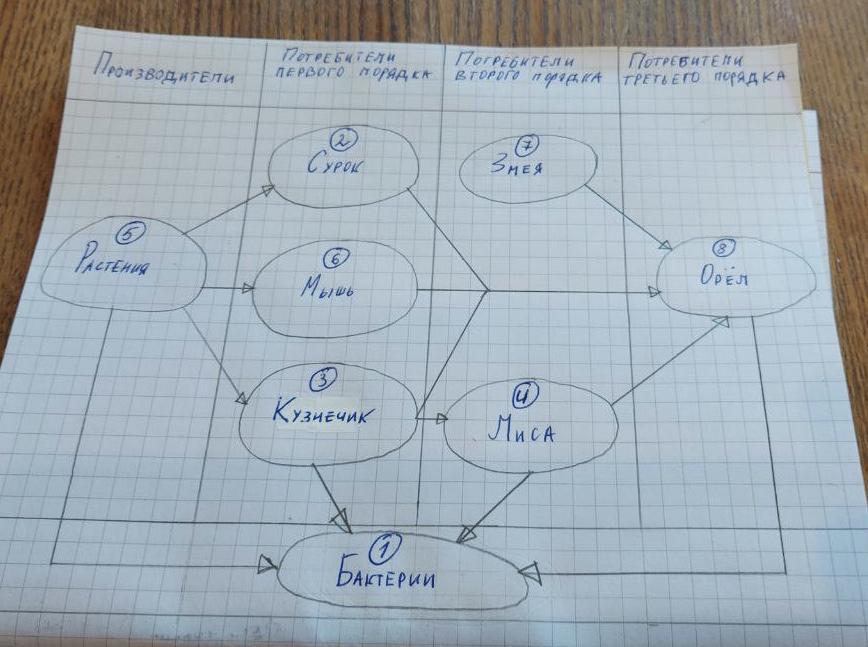 В этом задании представлена пищевая цепь пастбищного типа - она начинается с 1) автотрофных организмов или продуцентов, производителей, в данном случае - растений. Они, собственно, производят первичную биомассу, некий запас энергии, с которого начинается весь процесс её передачи к следующим звеньям цепи.