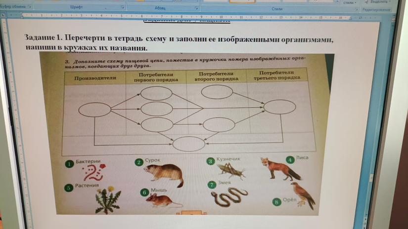 Перечерти в тетрадь схему и заполни ее изображенными организмами,