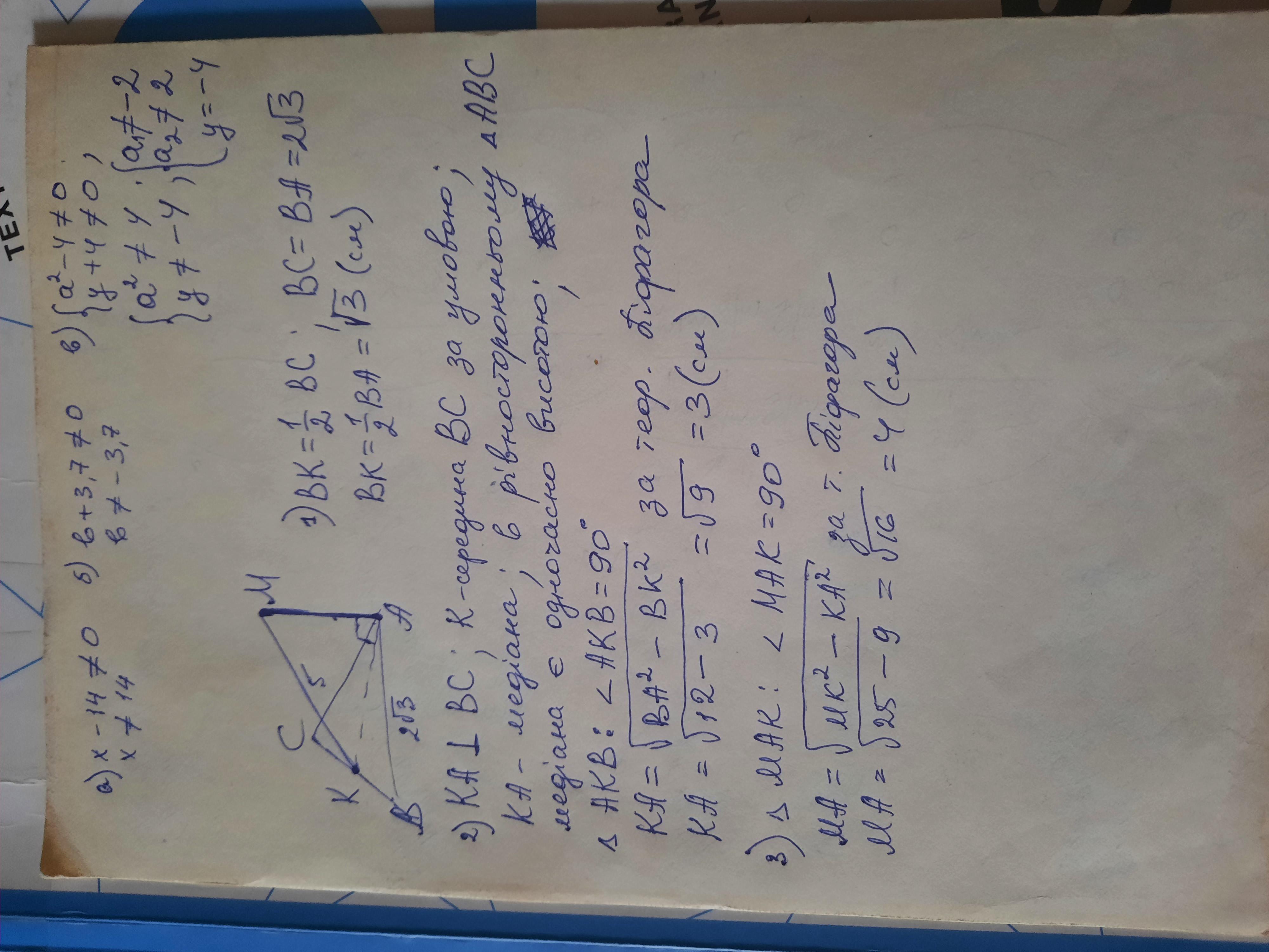БЛАГАЮ ДОПОМОЖІТЬ. Через вершину А рівностороннього трикутника АВС проведено перпендикуляр МА до площини трикутника. Точка К- середина сторони ВС. 1) Доведіть, що МК1 перпендикулярно ВС, 2) Знайдіть довжину відрізка МА, якщо АВ=2√3 см, МК-5см