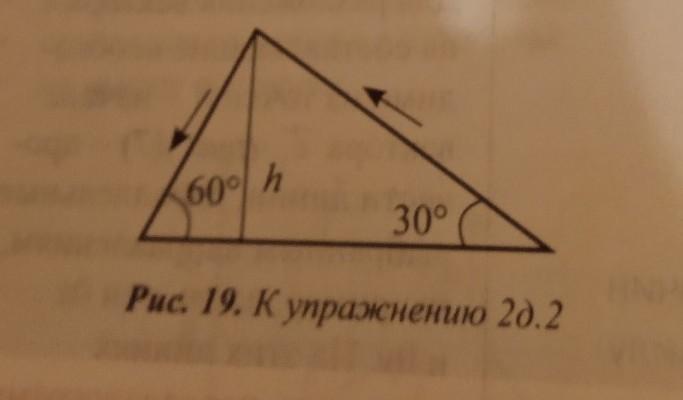 Турист поднялся на возмышенность высотой h=10 м с углом при основании 30°, а затем спустился с этой же высоты по уклону с углом при основании 60°(рис.19). Чему равны путь и модуль перемещения туриста? Ответ представьте в SI и округлите до целого числа