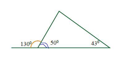 2) Один iз зовнішніх кутів трикутника дорівнює 130 градусів, а один iз кутів трикутника 43 градуси. Знайдіть решту кутів трикутника.
