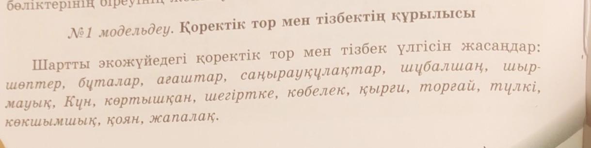 №1 модельдеу. Қоректік тор мен тізбектің құрылысы Шартты экожүйедегі қоректік тор мен тізбек үлгісін жасаңдар: шөптер, бұталар, ағаштар, саңырауқұлақтар, шұбалшаң, шыр- мауық, Күн, көртышқан, шегіртке, көбелек, қырғи, торғай, түлкі, көкшымшық, қоян, жапалақ.