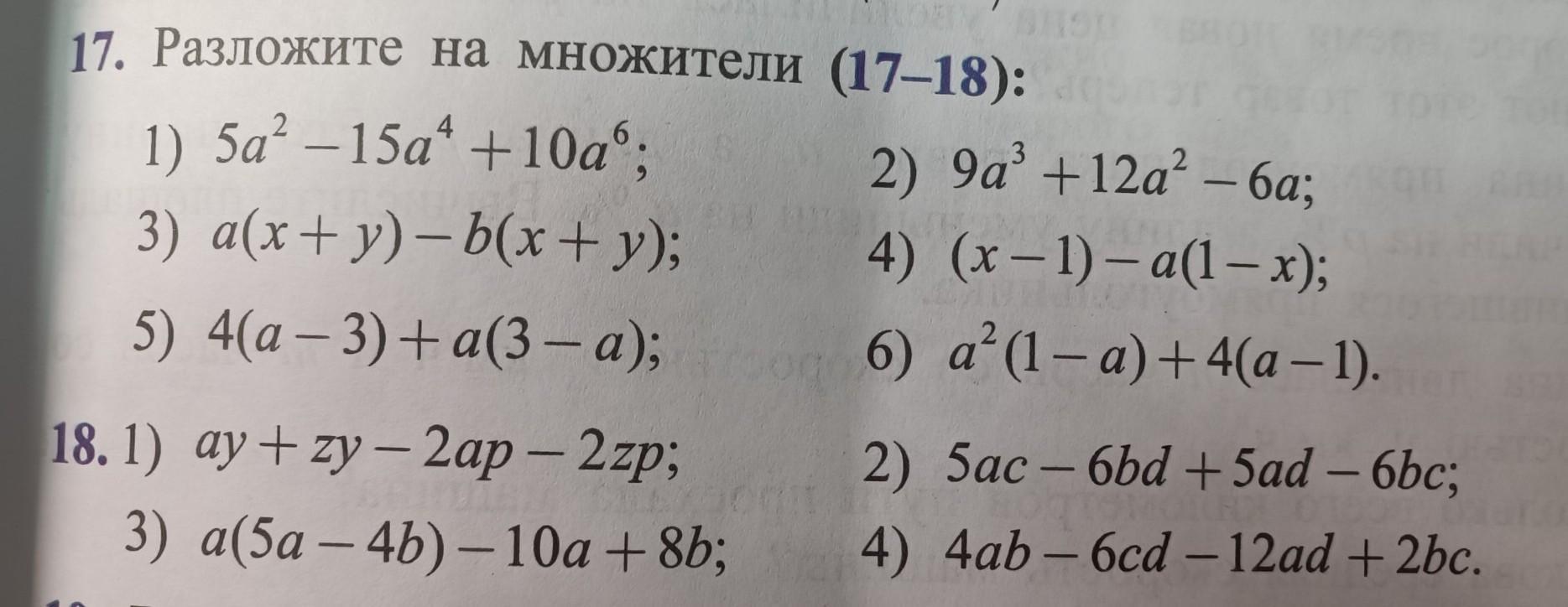 17. Разложите на множители (17-18): 1) 5a² -15a +10 3) a(x+y) -b(x+y); 5) 4(a - 3) +a(3-а); 18. 1) ay +zy-2ap - 2zp; 3) a(5a — 4b) —10a +8b; 2) 9a³ +12a²-6a; 4) (x-1) - a(1-x); 6) a²(1-a)+4(a-1). - 2) Sac - 6bd +5ad - 6bc; 4) 4ab - 6cd-12ad +2bc.