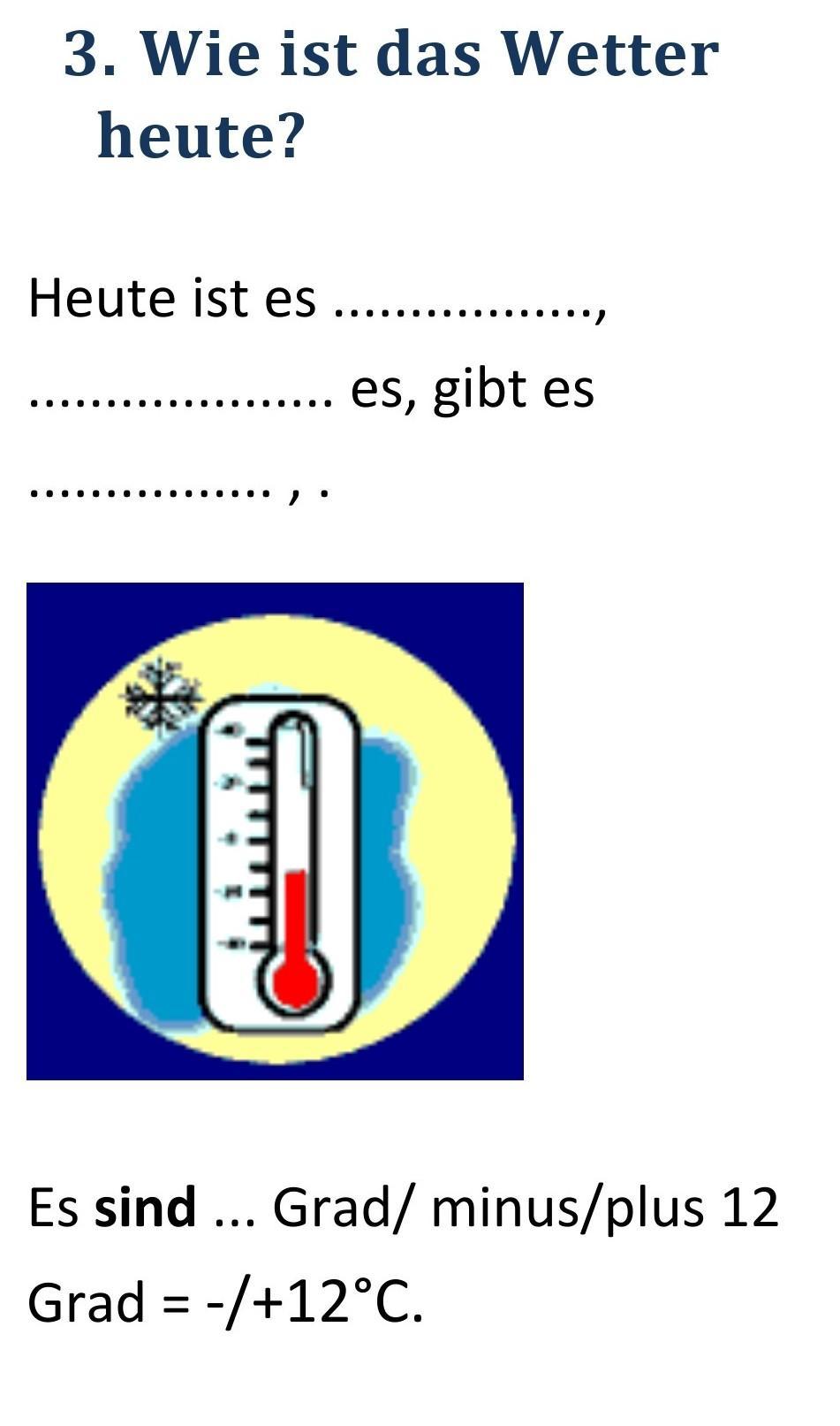 3. Wie ist das Wetter heute? Heute ist es .... "/ es, gibt es 0 Es sind ... Grad/ minus/plus 12 Grad = -/+12°C.