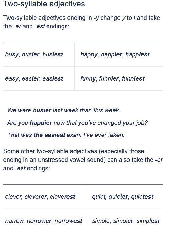 happier - easy(easier), funny (funnier), friendly(friendlier), pretty (prettier).