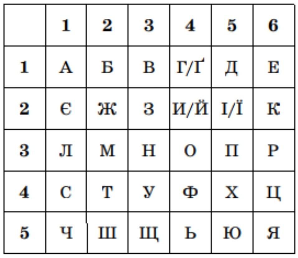 Задание - Закодувати своє ім'я та Прізвище за допомогою квадрата Полібія.