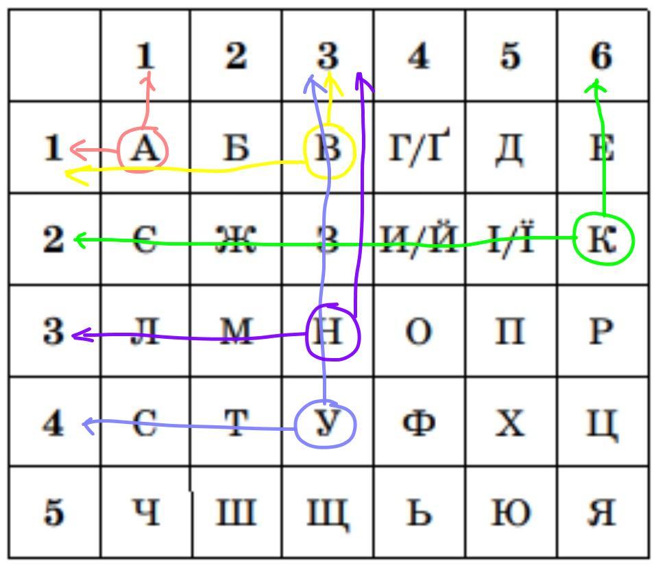26 - это 2 по горизонтали и 6 по вертикали, получаем "К"