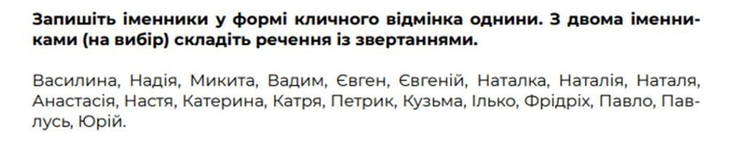 Запишіть іменники у формі кличного відмінка однини. З двома іменни- ками (на вибір) складіть речення із звертаннями. Василина, Надія, Микита, Вадим, Євген, Євгеній, Наталка, Наталія, Наталя, Анастасія, Настя, Катерина, Катря, Петрик, Кузьма, Ілько, Фрідріх, Павло, Пав- лусь, Юрій.
