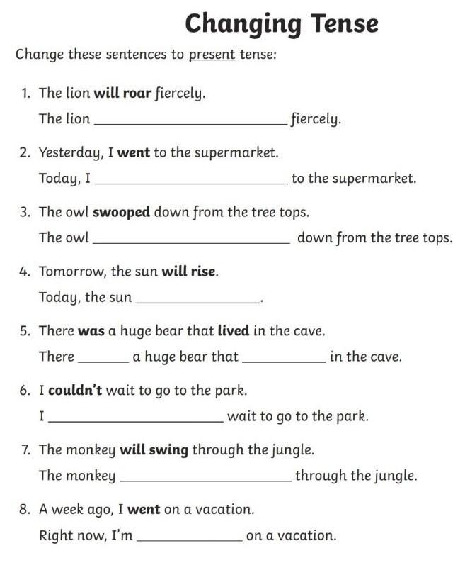 Changing Tense Change these sentences to present tense: 1. The lion will roar fiercely. The lion 2. Yesterday, I went to the supermarket. Today, I 4. Tomorrow, the sun will rise. Today, the sun 3. The owl swooped down from the tree tops. The owl fiercely. 6. I couldn't wait to go to the park. I to the supermarket. 5. There was a huge bear that lived in the cave. There a huge bear that down from the tree tops. 8. A week ago, I went on a vacation. Right now, I'm wait to go to the park. 7. The monkey will swing through the jungle. The monkey in the cave. through the jungle. on a vacation.