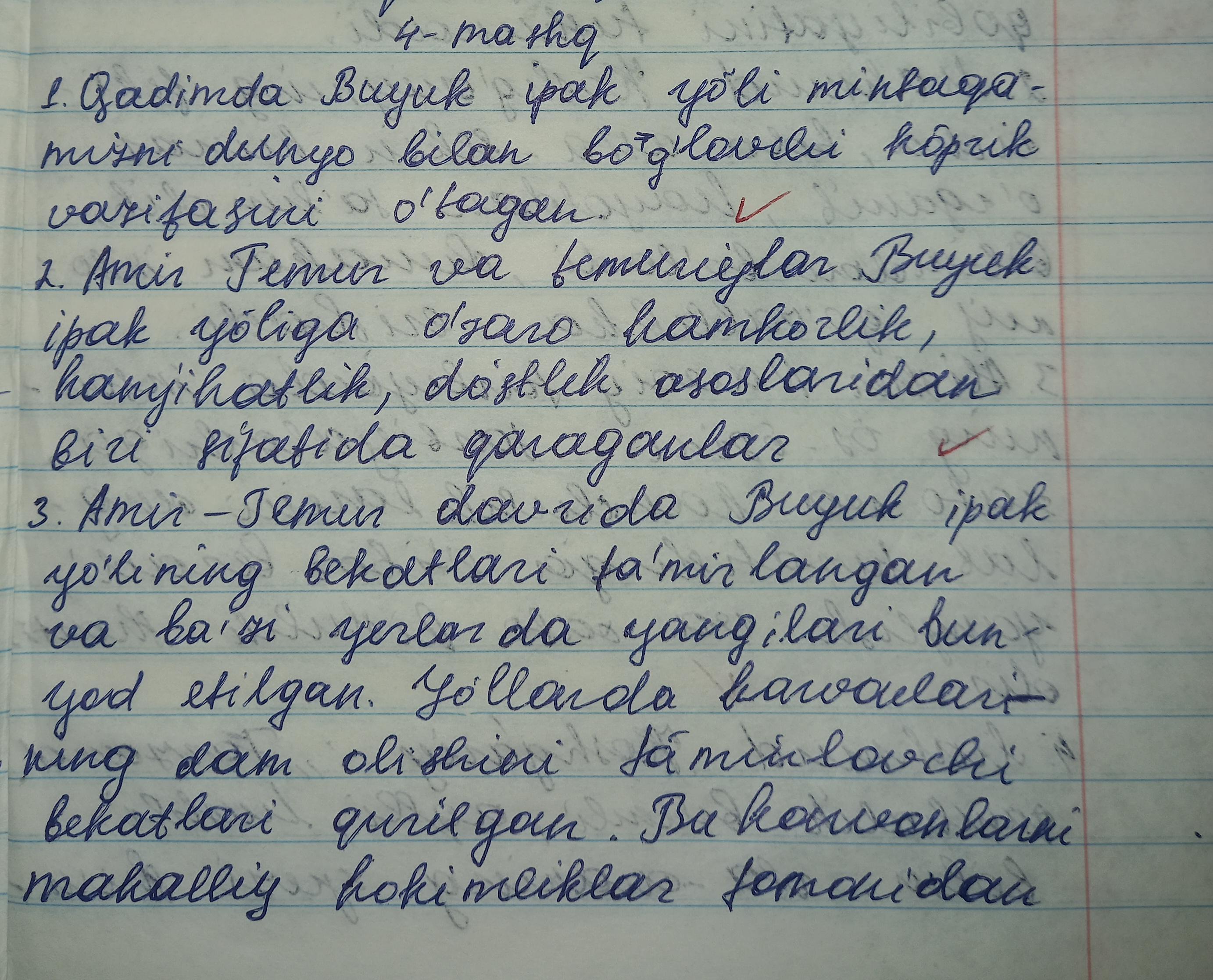 4 o'ylang va toping. Yozing. Blonog Foydalanish uchun soʻz va birikmalar: Amir Temur, harbiy qo'riqchilar, ilm-u fan taraq- qiyotida, bekatlari, mintaqamizni, karvonsaroylar, bunyod etilgan, Amir Temur va temuriylar. 1. Qadimda Buyuk ipak yo'li dunyo bilan bog'lovchi ko'prik vazifasini o'tagan. 2. Buyuk ipak yo'liga o'zaro hamkorlik, hamjihatlik, do'stlik asoslaridan biri sifatida qaraganlar. davrida Buyuk ipak yo'lining ta'mirlangan va ba'zi yerlarda yangilari Yo'llarda karvonlarning dam olishini ta'minlovchi qurilgan. Bu karvonlarni mahalliy hokimliklar tomonidan qo'yilgan_____ himoya qilib, bir manzildan ikkinchi manzilga yetkazib qo'ygan. 4. Buyuk ipak yo'li ham muhim o'rin tutgan.