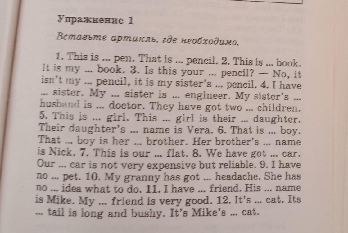 1 this is a pen. that is a pencil. 2. this is a book. It is my book. 3 Is this your pencil? — No, it isn't my pencil, it is my sister's pencil. 4. I have a sister. My sister is an engineer. My sister's husband is a doctor. They have got two children. 5. This is a girl. This girl is their daughter. Their daughter's name is Vera. 6. That is a boy. That boy is her brother. Her brother's name is Nick. 7. This is our flat. 8. We have got a car. Our car is not very expensive but reliable. 9. I have no pet. 10. My granny has got a headache. She has no idea what to do. 11. I have a friend. His name is Mike. My friend is very good. 12. It's a cat. Its tail is long and bushy. It's Mike's cat.