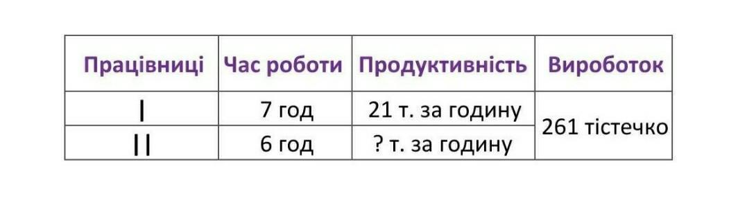 Перша працівниця щогодини прикрашала 21 тістечко. Пропрацювавши 7 годин, її вироботок склав: