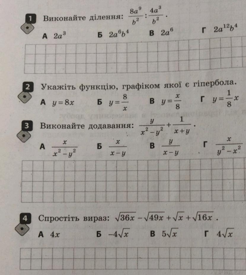 \displaystyle\bf\\1)\\\\\frac{8a^{9} }{b^{2} } :\frac{4a^{3} }{b^{2} } =\frac{8a^{9} }{b^{2} }\cdot\frac{b^{2} }{4a^{3} }=2a^{9-3} =2a^{6}  \\\\2)\\\\y=\frac{8}{x}\\\\3)\\\\\frac{y}{x^{2} - y^{2} }+\frac{1}{x+y}= \frac{y}{(x - y)\cdot(x+y) }+\frac{1}{x+y}= \\\\\\=\frac{y+x-y}{(x-y)(x+y)} =\frac{x}{x^{2} - y^{2} } \\\\4)\\\\\sqrt{36x} -\sqrt{49x}+\sqrt{x} +\sqrt{16x} =\\\\\\= \sqrt{36x} -\sqrt{49x}+\sqrt{x} +\sqrt{16x} =