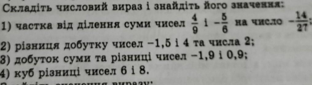 7. складіть числовий вираз і знайдіть його значення: 1) частка від ділення суми чисел 4/9 * 1 - 5/6 на число 2) різниця добутку чисел -1,5 1 4 та числа 2; 3) добуток суми та різниці чисел -1,91 0,9; 4) куб різниці чисел 6 |8 - 14/27