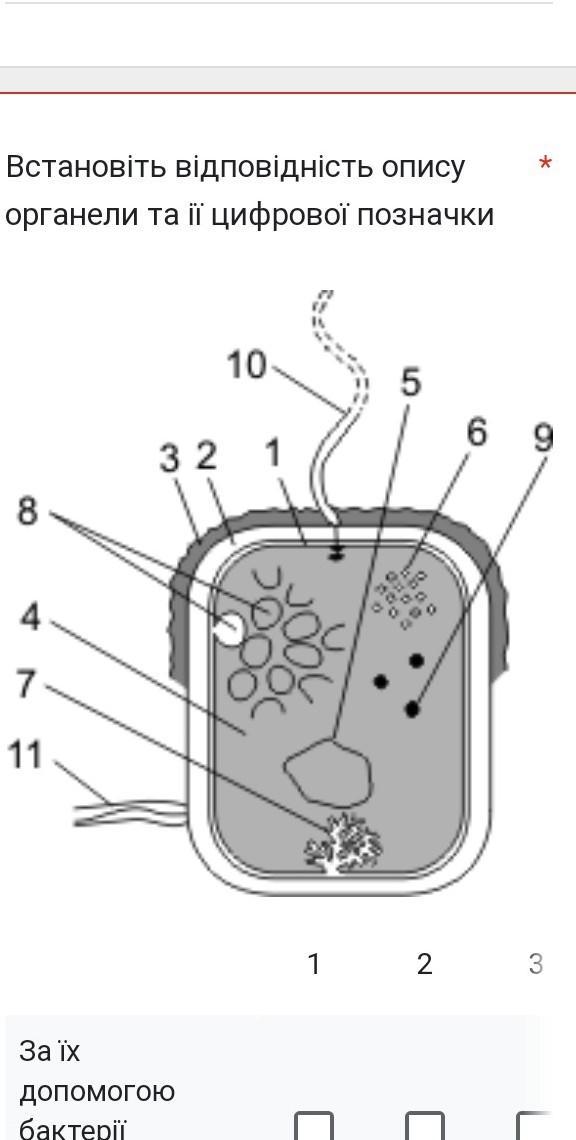 1 — цитоплазматическая мембрана; 2 — клеточная стенка; 3 — слизистая капсула; 4 — цитоплазма; 5 — хромосомная ДНК; 6 — рибосомы; 7 — мезосома; 8 — фотосинтетические мембраны; 9 — включения; 10 — жгутики; 11 — пили.