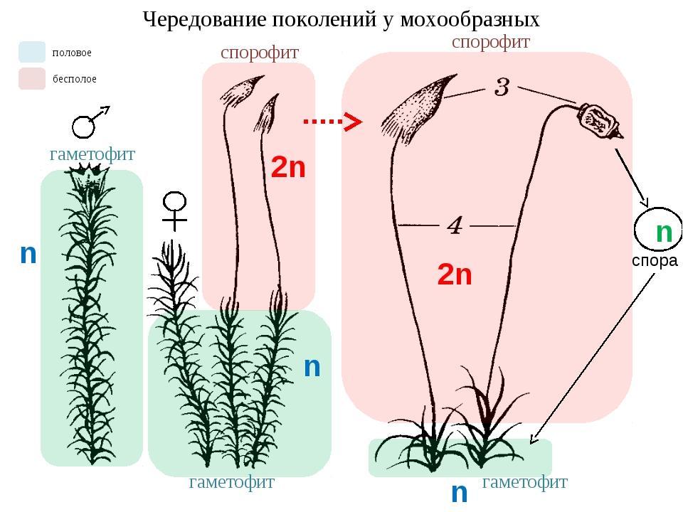 Спорофит у мхов представлен коробочкой, расположенной на зеленом гаметофите.