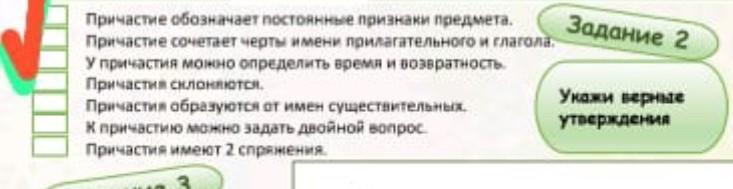 Причастие обозначает постоянные признаки предмета. Причастие сочетает черты имени прилагательного и глагола У причастия можно определить время и возвратность Причастни склоняются. Причастия образуются от имен существительных. К причастию можно задать двойной вопрос Причастия имеют 2 спряжения Задание 2 Укажи верные утверждения