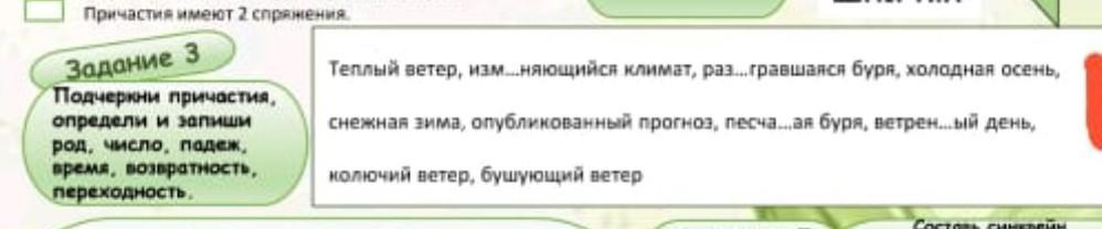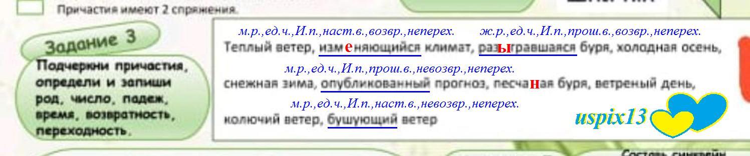 Причастия имеют 2 спряжения Задание 3 Подчеркни причастия, определи и запиши род, число, падеж, время, позвратность, переходность. Теплый ветер, изм...няющийся климат, раз...гравшаяся буря, холодная осень, снежная зима, опубликованный прогноз, песча...ая буря, ветрен...ый день, КОЛЮЧИЙ ветер, бушующий ветер V
