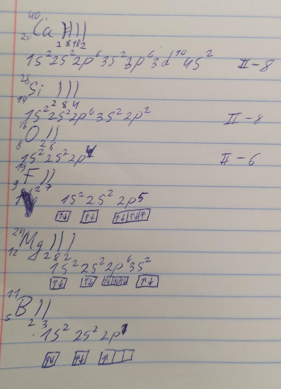 1. Келтiрiлген элементтердің электронды-құрылымдық формулаларын жазындар: Ca, Si, O. 2. Екiншi энергетикалык денгейдегі электрондар санын есептендер. 3. Көрсетілген элементтердiн валенттілік электрондарынын формулаларын жазындар: F, Mg, B.