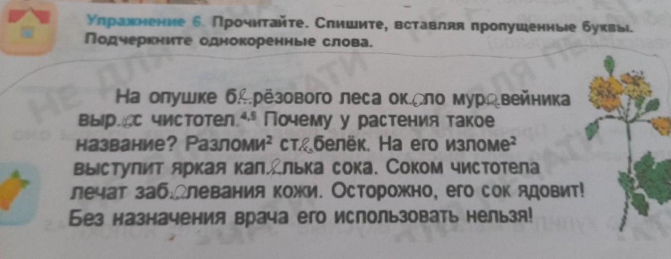 Упражнение 6. Прочитайте. Спишите, вставляя пропущенные буквы. Подчеркните однокоренные слова. Джа На опушке б...рёзового леса ок...ло мур....вейника выр...с чистотел. 45 Почему у растения такое название? Разломи² ст...белёк. На его изломе² выступит яркая кап...лька сока. Соком чистотела лечат заб...левания кожи. Осторожно, его сок ядовит! Без назначения врача его использовать нельзя!