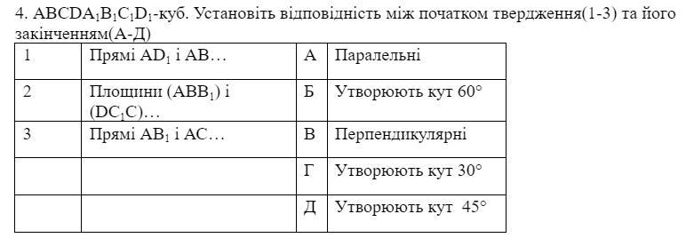 АВСDA1B1C1D1-куб. Установіть відповідність між початком твердження(1-3) та його закінченням(А-Д)