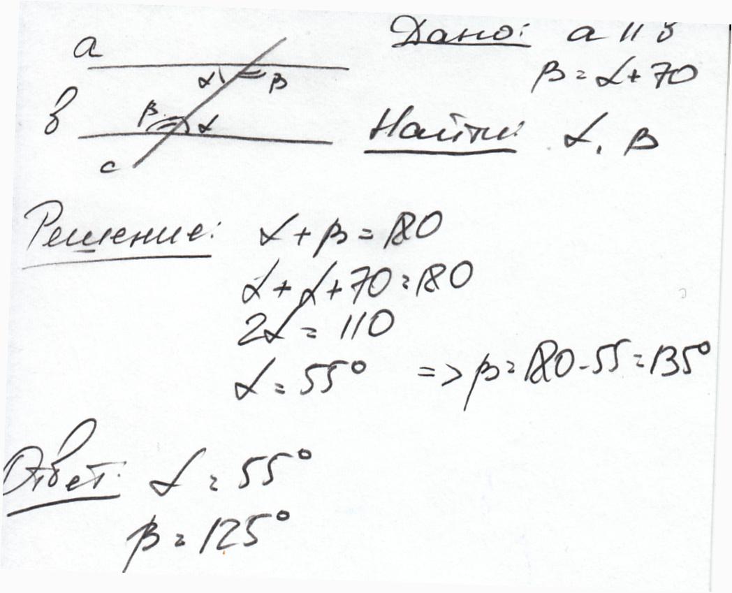 Найдите все углы,образованные при пересечении двух параллельных прямых a и b ,секущей с,если: один из углов на 70 град. больше другого.