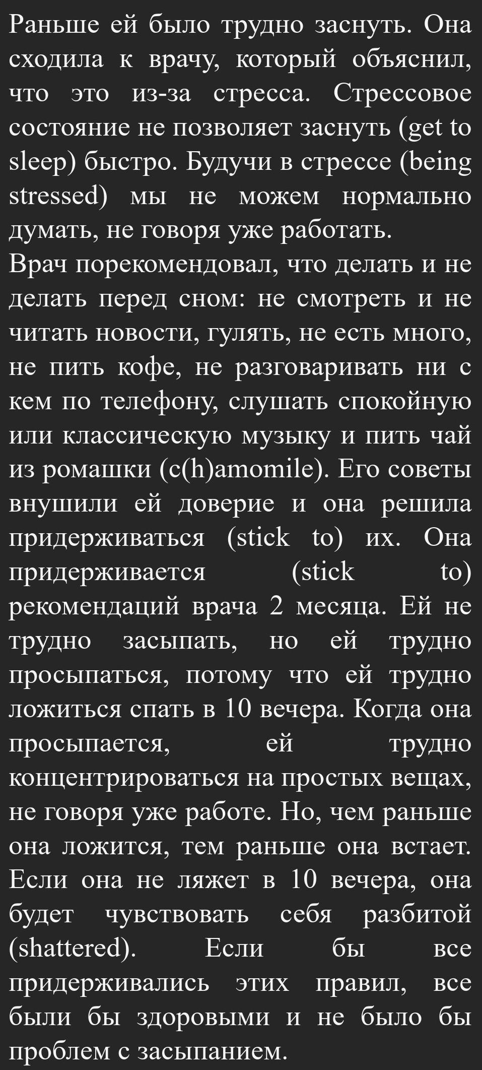 The doctor recommended what to do and not to do before going to bed: do not watch or read the news, take a walk, do not eat much, do not drink coffee, do not talk to anyone on the phone, listen to calm or classical music and drink chamomile tea (c(h )amomile). His advice inspired her confidence and she decided to stick to them. She sticks to the doctor's recommendations for 2 months. It's not hard for her to fall asleep, but it's hard for her